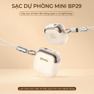 Điểm cộng lớn nhất của sạc dự phòng BP29 chính là việc tích hợp sẵn dây sạc đi kèm đa năng. Bạn sẽ không còn phải lo lắng về việc quên mang theo dây cáp vì BP29 đã trang bị sẵn đầu Type-C và Lightning, phù hợp cho mọi thiết bị hiện nay.