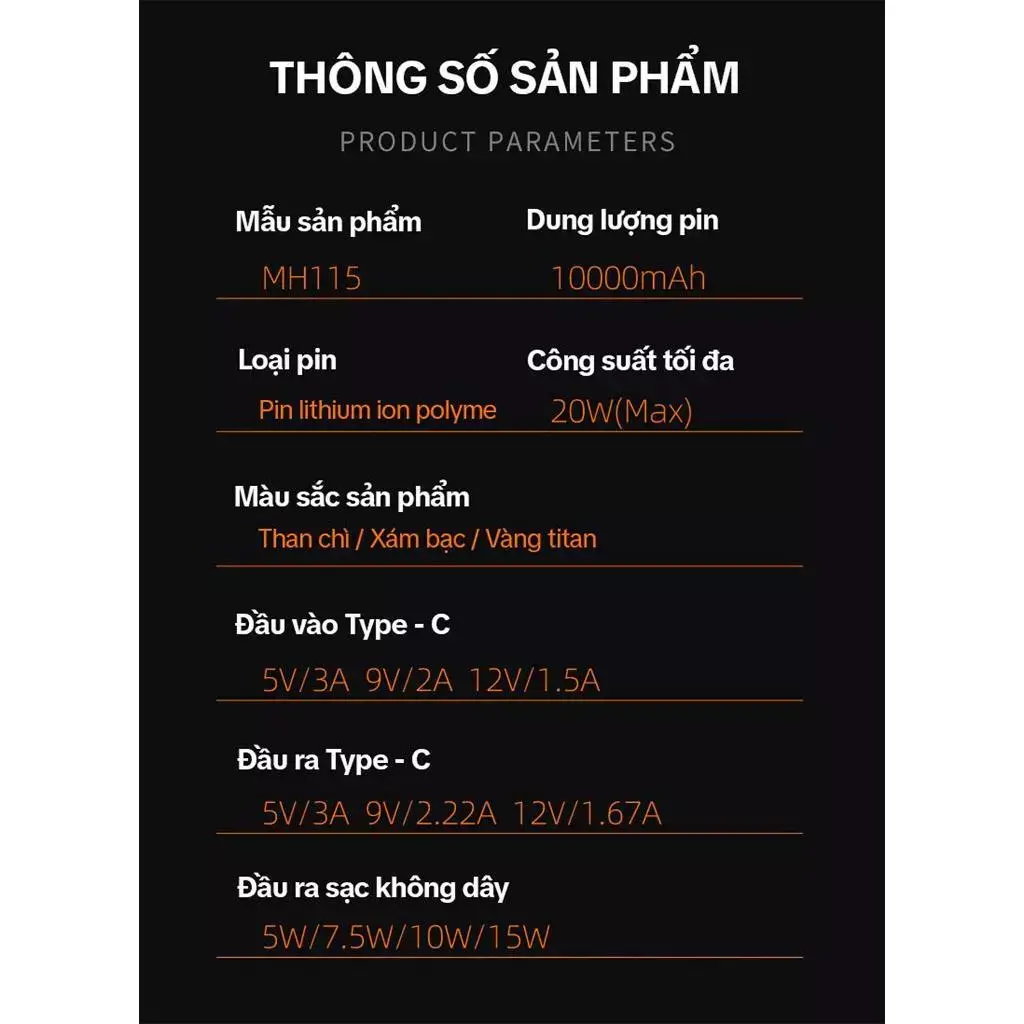 🚀 Sạc nhanh: Hỗ trợ chuẩn PD/QC qua cổng Type-C với công suất đầu ra 20.5W và đầu vào 22.5W.
