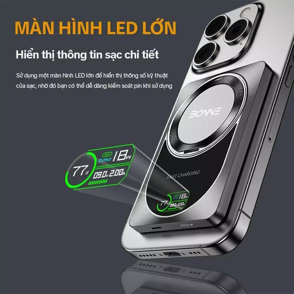 📱 Màn hình LED thông minh: Hiển thị phần trăm pin, công suất sạc (W) và điện áp (V) theo thời gian thực.